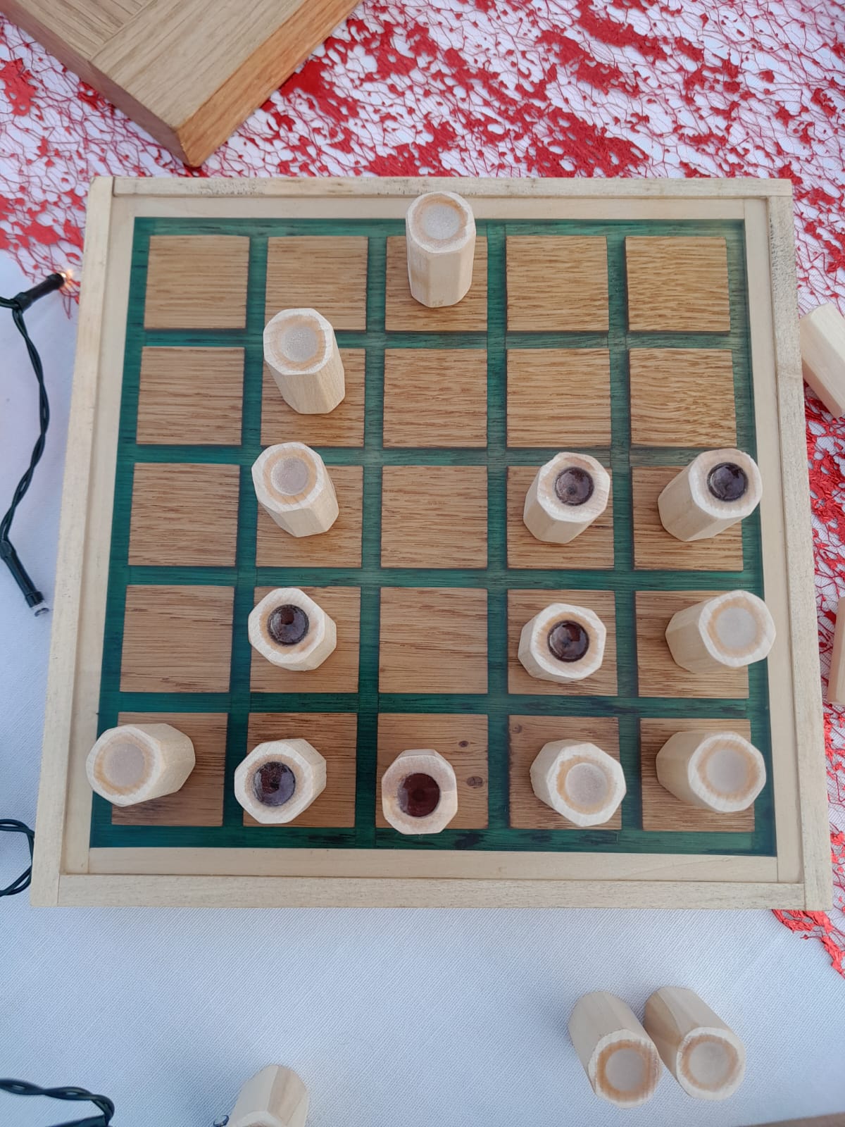 Joué en Afrique du Nord, c’est un jeu de stratégie aux règles simples. On pose ou déplace ses pions afin de pouvoir prendre l’un de ceux de l’adversaire en sautant par-dessus. La particularité est que chaque prise autorise le preneur à retirer un second pion de son adversaire là où il le souhaite.